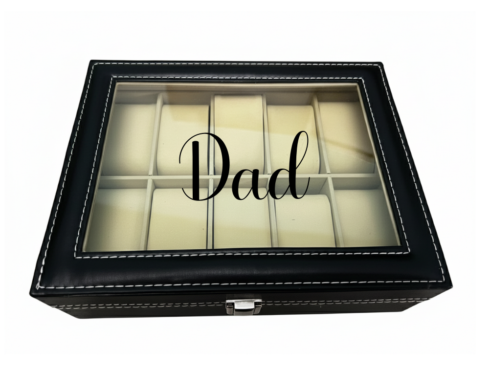 Keep watches safe and beautifully displayed with the Dad 10 Compartment Watch Organiser. Crafted from elegant black PU leather and finished with a clear Perspex window, this organiser blends durability with timeless style. The Dad motif makes it a thoughtful and practical gift for fathers who appreciate organisation and elegance.