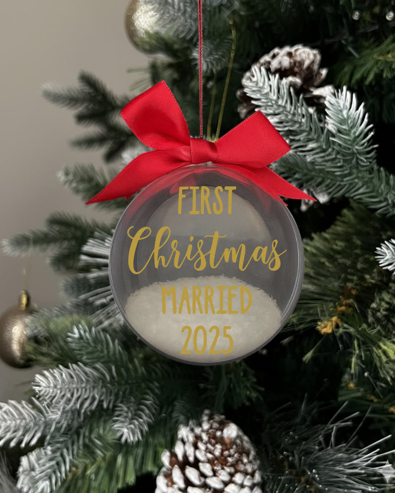 Crafted from durable, crystal-clear acrylic, this bauble is designed to last for many Christmases while beautifully displaying your chosen design. Perfect for gifting or keeping as a special memento to commemorate your first Christmas married in 2025.