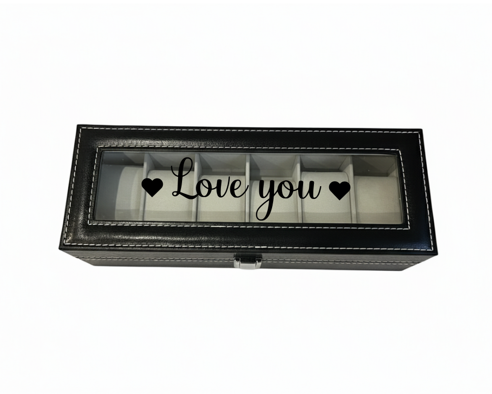 Show your affection with the Love You 6 Compartment Watch Organiser, beautifully designed with a heart motif on both ends of the inscription. Made from elegant black PU leather and finished with a clear Perspex window, this organiser combines practicality with a heartfelt touch. The Love You design makes it an ideal romantic gift for birthdays, anniversaries, Valentine’s Day, or simply to surprise someone special.