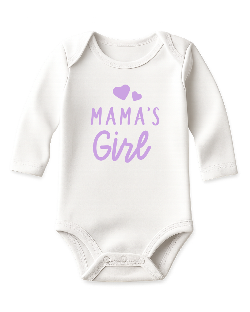 Celebrate the special bond between mother and daughter with the Mama’s Girl Baby Onesie. This adorable white baby grow is a sweet addition to any little girl’s wardrobe and makes a thoughtful gift for new moms. Available in both short sleeve and long sleeve styles, it’s perfect for everyday wear, photoshoots, or baby showers.