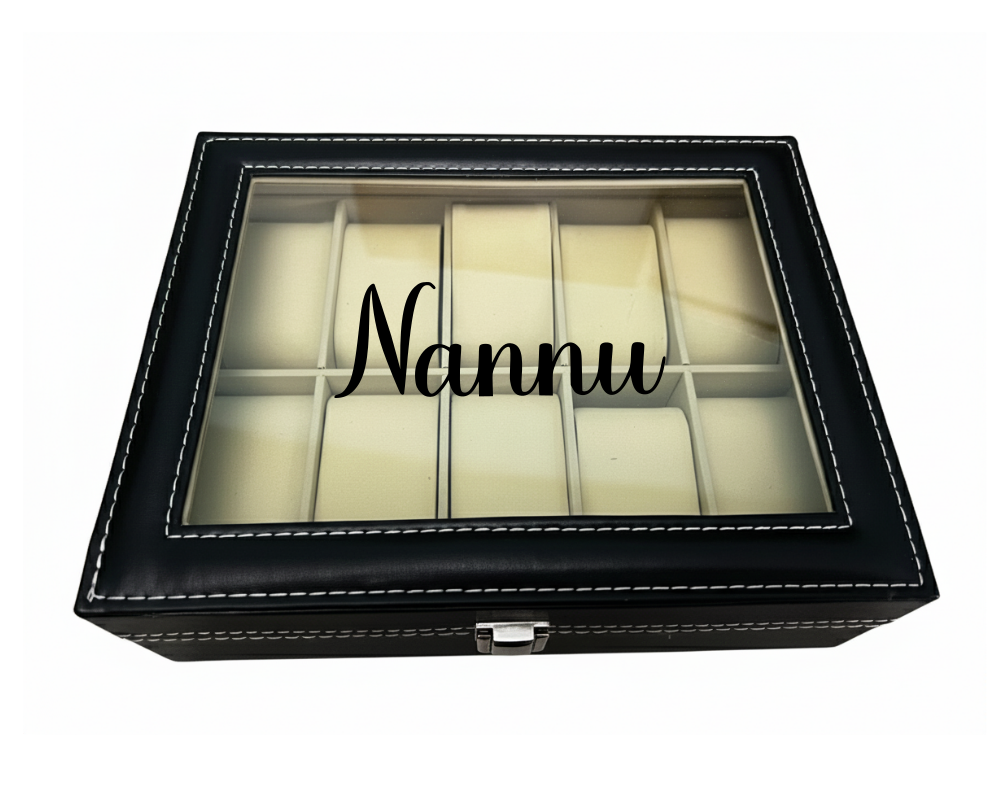 Stylish nannu 10 compartment watch organiser in black PU leather with a clear Perspex window. A thoughtful gift for Maltese grandfathers.