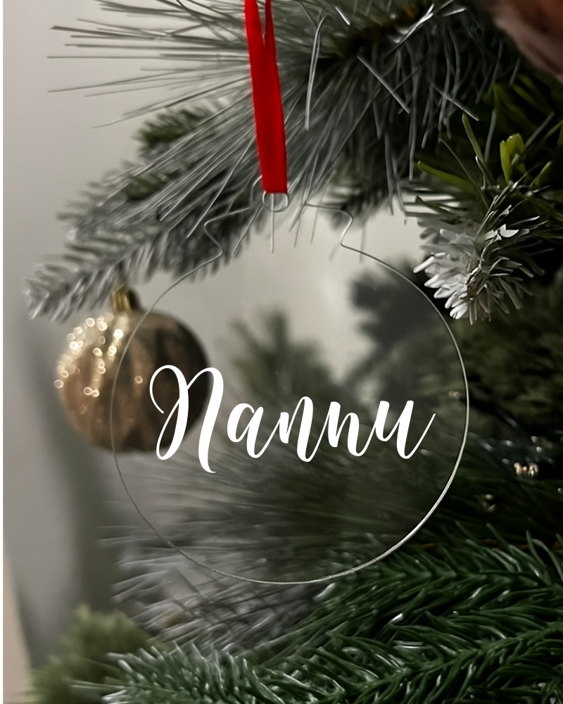 Nannu flat acrylic bauble, 6.5 cm. Transparent festive decoration and meaningful Christmas keepsake for grandfathers.