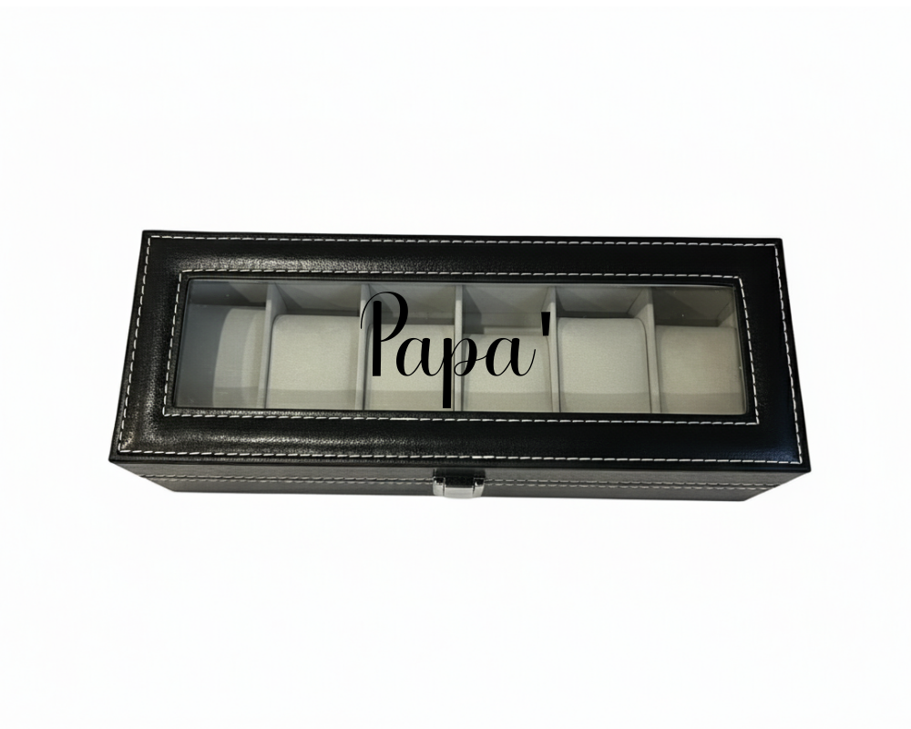 Stylish papa’ 6 compartment watch organiser in black PU leather with a clear Perspex window. A thoughtful and practical gift for fathers.