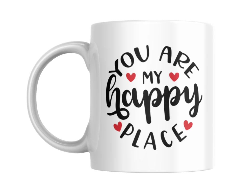 Ceramic white mug featuring the You Are My Happy Place design on both sides. 330 ml capacity, ideal for everyday drinks or as a heartfelt gift.